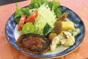地元や家庭菜園で採れた減農薬野菜や米など、厳選した素材を使った山菜中心のヘルシーランチは、季節ごとのおいしい旬の料理が味わえます。人気メニューは、八女伝統の郷土料理でもある「だんご汁ランチ」。小麦粉ともち粉を配合した弾力のあるモチモチ食感のだんごに、自家製の味噌を使用しただんご汁は、他にはない特別な味わいです。具材も、地元で育った里芋、大根、人参、白菜、ネギ、とボリュームたっぷり。ほかにも、国産和牛を使用したやわらかくてジューシーなハンバーグや、ハヤシライスもおすすめです。